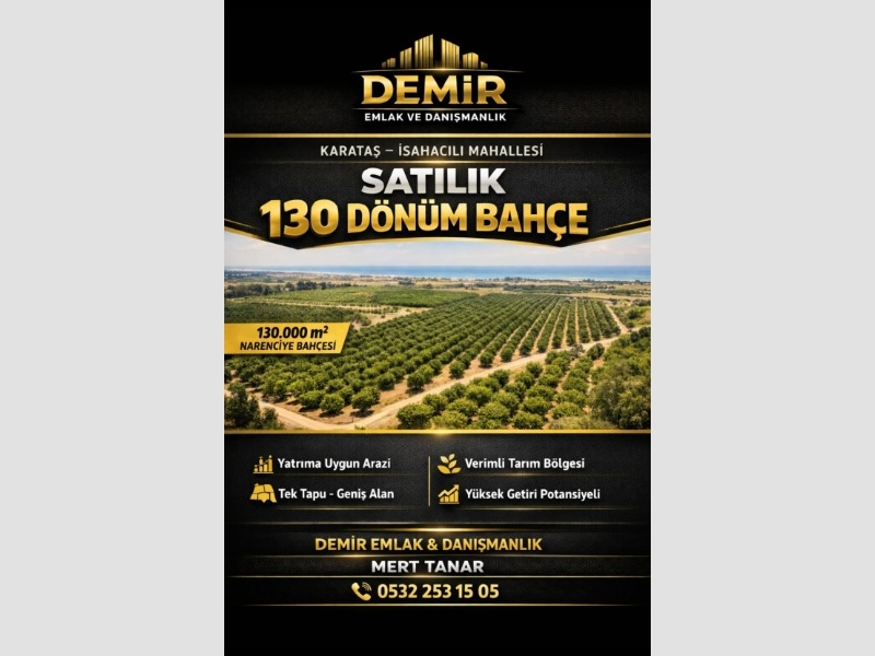 **KARATAŞ İSAHACILI'DA SATILIK 130 DÖNÜM BAHÇE